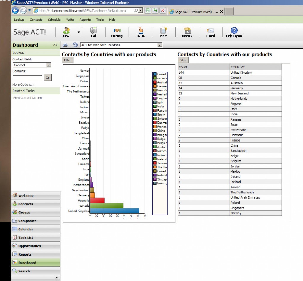 Ok, so, if you add this SQL statement to the Act.dashboard.datachart.xml file that is located on the ACT for the Web server in the Program files\ACT\ACT for Web\tools folder, and then build a dashboard using that template, that dashboard will be visible on the web. Here is an example of one of my dashboards shown in Internet Explorer.